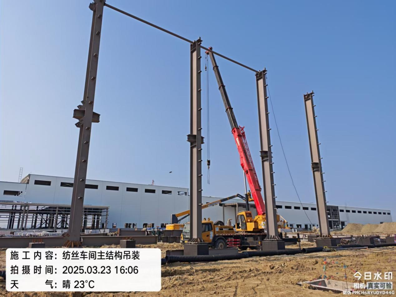 目前,项目已经完成了中央控制室、35KV变电所的结构封顶;计划最先开车的碳化车间厂房已完成钢结构安装,屋面、墙面也已完成80%;纺丝车间、原丝暂存库、碳丝暂存库已完成基础施工,正在进行钢结构搭建。接下来,施工团队将在春季加快土建部分的施工进度,为后续设备安装和调试留出充足时间,力争在10月建成投产。